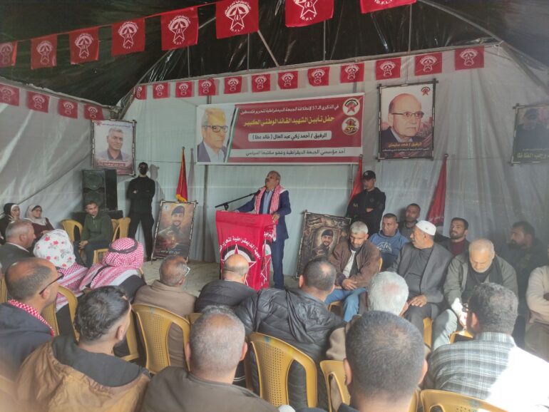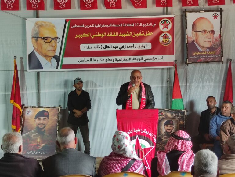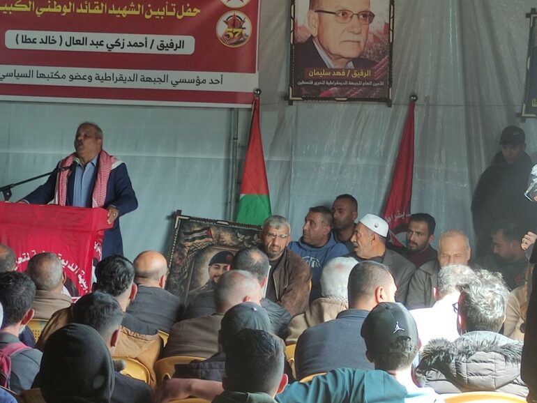 أحيت الجبهة الديمقراطية لتحرير فلسطين الذكرى السابعة والخمسين لانطلاقتها بتنظيم حفل تأبين للقائد الوطني الراحل أحمد زكي عبد العال (خالد عطا)، عضو مكتبها السياسي وأحد مؤسسيها، وسط حضور وطني وشعبي واسع ودعوات متجددة لإنهاء الانقسام الفلسطيني وتعزيز الوحدة الداخلية.