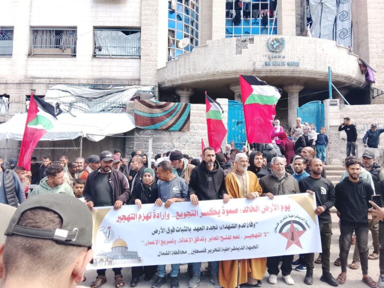 في مشهد جماهيري حمل دلالات سياسية ووطنية واسعة، أحيت الجبهة الديمقراطية لتحرير فلسطين، اليوم الاثنين، الذكرى السنوية لـيوم الأرض الخالد بتنظيم مسيرة حاشدة في مخيم جباليا شمال قطاع غزة، وسط دعوات متجددة لوقف الحرب، وفتح المعابر، وتسريع جهود الإغاثة وإعادة الإعمار.