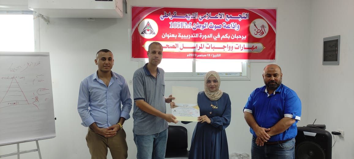 نظمت إذاعة صوت الوطن بالشراكة مع التجمع الإعلامي الديمقراطي، دورة تدريبية بعنوان «مهارات وواجبات المراسل الصحفي» بواقع 15 ساعة تدريبية، وذلك بمدينة غزة.