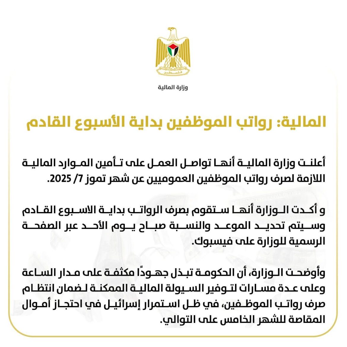 غزة— إذاعة صوت الوطن أعلنت وزارة المالية الفلسطينية، اليوم الخميس، أنها تواصل العمل على تأمين الموارد المالية اللازمة لصرف رواتب الموظفين العموميين عن شهر تموز/ يوليو 2025. وأكدت الوزارة في بيان لها، أنها ستباشر صرف الرواتب بداية الأسبوع القادم، مشيرة إلى أنه سيتم تحديد الموعد الدقيق ونسبة الصرف صباح يوم […]